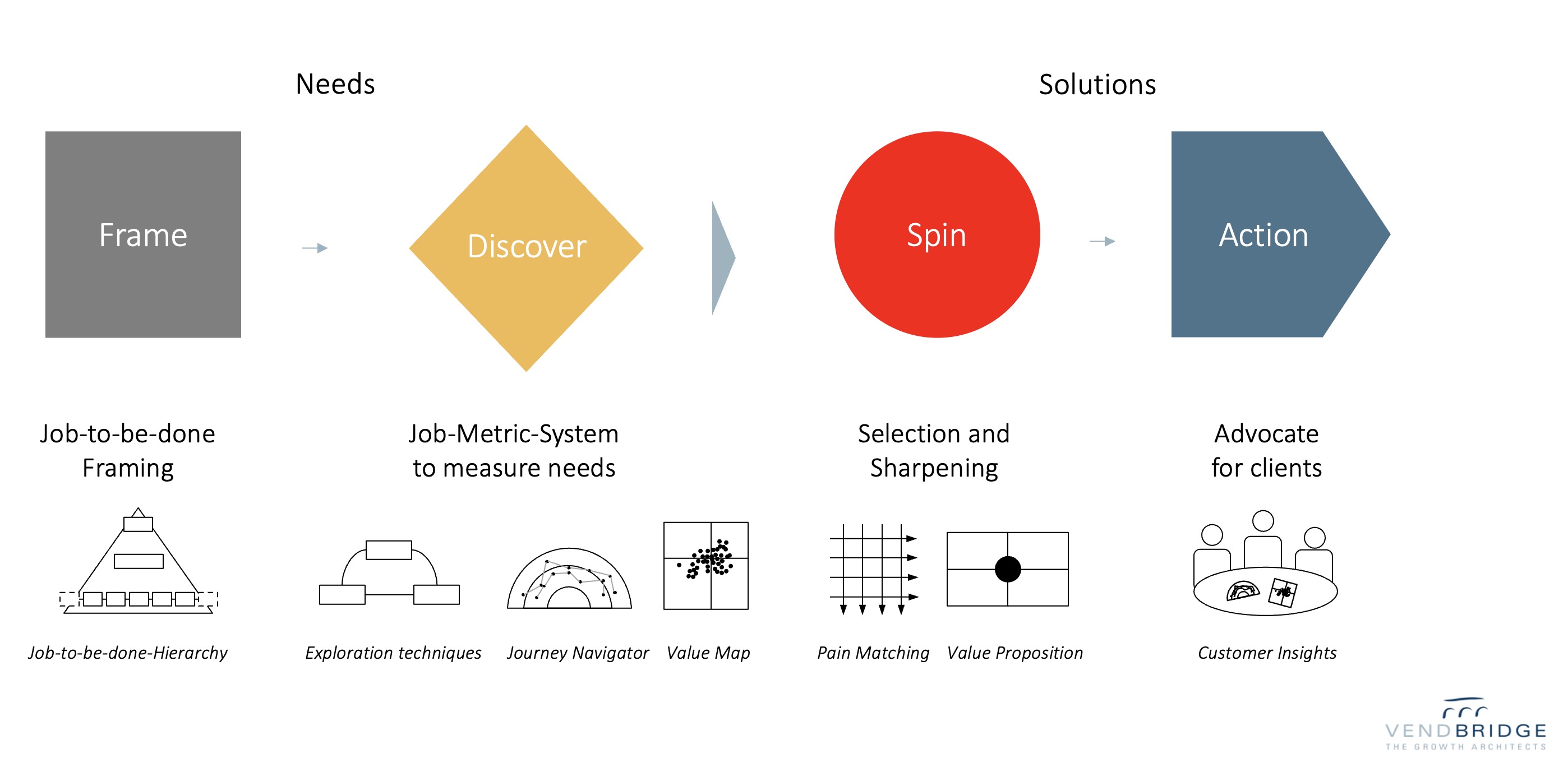 While Frame and Discover are all about measuring the customer need, Spin and Action are about creating winning solutions and strategies. Hence, CFI combines seamlessly the customer problem space with the solution space.